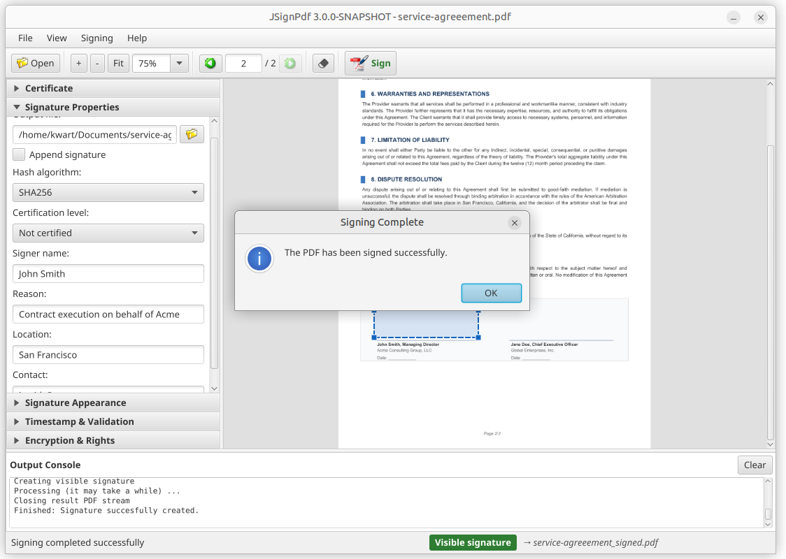 Signature properties expanded, with the signing result dialog and output console.